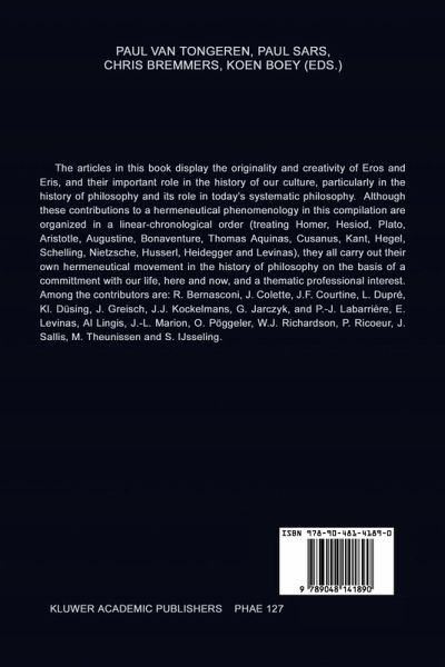 The articles in this book display the originality and creativity of Eros and Eris, and their important role in the history of our culture, particularly in the history of philosophy and its role in today's systematic philosophy. Although these contributions to a hermeneutical phenomenology in this compilation are organized in a linear-chronological order (treating Homer, Hesiod, Plato, Aristotle, Augustine, Bonaventure, Thomas Aquinas, Cusanus, Kant, Hegel, Schelling, Nietzsche, Husserl, Heidegger and Levinas), they all carry out their own hermeneutical movement in the history of philosphy on the basis of a commitment with out life, here and now, and a thematic, professional interest. Among the contributors are: R. Bernasconi, J. Colette, J.F. Courtine, L. Dupré, Kl. Düsing, J. Greisch, J. Kockelmans, P.-J. Labarrière and G. Jarczyk, E. Levinas, Al. Lingis, J.-L. Marion, O. Pöggeler, W. Richardson, P. Ricoeur, J. Sallis, M. Theunissen and S. IJsseling.