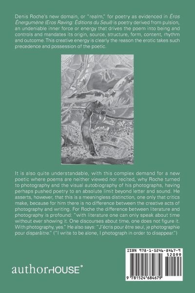 Denis Roche’s new domain, or "realm," for poetry as evidenced in Éros Énergumène (Eros Raving: Éditions du Seuil) is poetry derived from pulsion, an undeniable inner force or energy that drives the poem into being and controls and mandates its origin, source, structure, form, content, rhythm and outcome. This creative energy is clearly the reason the erotic takes such precedence and possession of the poetic. It is also quite understandable, with this complex demand for a new poetic where poems are neither viewed nor recited, why Roche turned to photography and the visual autobiography of his photographs, having perhaps pushed poetry to an absolute limit beyond letter and sound. He asserts, however, that this is a meaningless distinction, one only that critics make, because for him there is no difference between the creative acts of photography and writing. For Roche the difference between literature and photography is profound: "with literature one can only speak about time without ever showing it. One discourses about time, one does not figure it. With photography, yes." He also says: "J’écris pour être seul, je photographie pour disparâitre." ("I write to be alone, I photograph in order to disappear.")