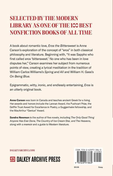 "A book about romantic love, Eros the Bittersweet is Anne Carson's exploration of the concept of "eros" in both classical philosophy and literature. Beginning with, "It was Sappho who first called eros 'bittersweet.' No one who has been in love disputes her," Carson examines her subject from numerous points of view, creating a lyrical meditation in the tradition of William Carlos Williams's Spring and All and William H. Gass's On Being Blue. Epigrammatic, witty, ironic, and endlessly entertaining, Eros is an utterly original book"--