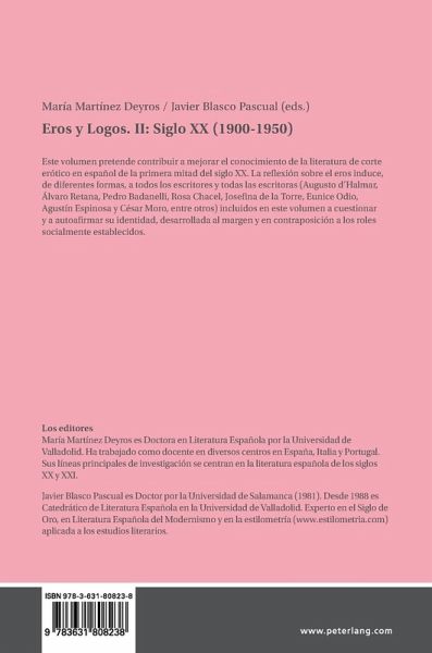 Este volumen pretende contribuir a mejorar el conocimiento de la literatura de corte erótico en español de la primera mitad del siglo XX. La reflexión sobre el eros induce, de diferentes formas, a todos los escritores y todas las escritoras (Augusto d¿Halmar, Álvaro Retana, Pedro Badanelli, Rosa Chacel, Josefina de la Torre, Eunice Odio, Agustín Espinosa y César Moro, entre otros) incluidos en este volumen a cuestionar y a autoafirmar su identidad, desarrollada al margen y en contraposición a los roles socialmente establecidos.