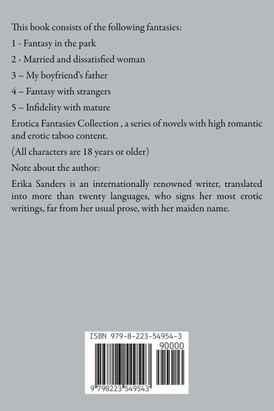 This book consists of the following fantasies: 1 - Fantasy in the park 2 - Married and dissatisfied woman 3 - My boyfriend's father 4 - Fantasy with strangers 5 - Infidelity with mature Erotica Fantasies Collection , a series of novels with high romantic and erotic taboo content. (All characters are 18 years or older) Note about the author: Erika Sanders is an internationally renowned writer, translated into more than twenty languages, who signs her most erotic writings, far from her usual prose, with her maiden name.