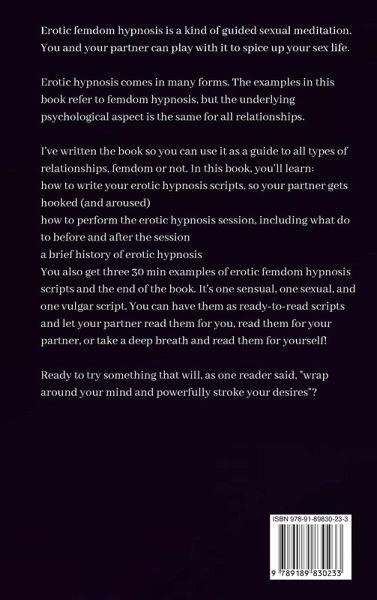 Erotic femdom hypnosis is a kind of guided sexual meditation. You and your partner can play with it to spice up your sex life. It's a tool to experience total relaxation and let your sexual fantasies run wild. Erotic hypnosis comes in many forms. The examples in this book refer to femdom hypnosis, but the underlying psychological aspect is the same for all relationships. I've written the book so you can use it as a guide to all types of relationships, femdom or not. In this book, you'll learn: * how to write your erotic hypnosis scripts so your partner gets hooked (and aroused) * how to perform the erotic hypnosis session, including what to do before and after the session * a brief history of erotic hypnosis * You also get three 30 min examples of erotic femdom hypnosis scripts and the end of the book. It's one sensual, one sexual, and one vulgar script. You can have them as ready-to-read scripts and let your partner read them for you, read them for your partner, or take a deep breath and read them for yourself! * And much more! Ready to try something that will, as one reader said, "wrap around your mind and powerfully stroke your desires"?