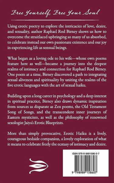 Using erotic poetry to explore the intricacies of love, desire, and sexuality, author Raphael Rod Birney shows us how to overcome the straitlaced upbringing so many of us absorbed, to celebrate instead our own passionate existence and our joy in experiencing life as sensual beings. What began as a loving ode to his wife-whose own poems feature here as well-became a journey into the deepest realms of intimacy and connection for Raphael Rod Birney. One poem at a time, Birney discovered a path to integrating sexual aliveness and spirituality by uniting the realms of the five erotic languages with the art of sexual haiku. Building upon a long career in psychology and a deep interest in spiritual practice, Birney also draws dynamic inspiration from sources as disparate as Zen poems, the Old Testament Song of Songs, and the transcendent inner journeys of Eastern mysticism, as well as the philosophy of renowned sexologist Jaiya's Erotic Blueprints. More than simply provocative, Erotic Haiku is a lively. courageous bedside companion, a lovely exploration of what it means to celebrate freely the ecstasy of intimacy and desire.