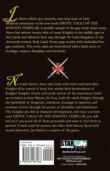 Jay Starre offers up a raunchy, non-stop feast of lusty medieval adventures in his new book Erotic Tales of the Knights Templar. A prolific wizard of the gay erotic short story, Starre has written twenty tales of nasty Knights in the middle ages as they battle and debauch their way through the Latin Kingdom of the thirteenth century Holy Land. Every page sizzles with unabashed hot gay eroticism. The erotic tales are intertwined with a back story of bondage, respect, discipline and servitude. No holds barred, these tales brim with brave and masculine Knights all in search of lusty love within their brotherhood of Knights Templar. Exotic and erotic secrets of the mysterious Order are revealed as their Master, Sir Guy, leads his randy Knights through the battlefield of dungeons, initiations, bondage in captivity, and eventual victory through the power of discipline and submission. The Knights are rich in character development, and once you have read Erotic Tales of the Knights Templar, you will feel as if you know all of them personally and want to feel them in person! A must read for anyone who likes their history laced with sexual adventure. Jay Starre is a master of the genre.