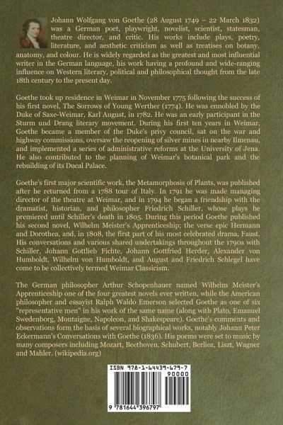 JOHANN WOLFGANG VON GOETHE (1749-1832) was a German poet, writer, scientist, statesman, and one of the greatest German literary figures. Goethe, the eldest of seven children born in a wealthy Frankfurt family, studied law at the universities of Leipzig and Strasbourg. He wrote novels and poetry, dramas, treatises on botany, and literary criticism, among which are his successful novels The Sorrows of Young Werther (1774) and Wilhelm Meister's Apprenticeship (1795). Early in his life, Goethe was a member of the Sturm und Drang literary movement, emphasizing free expression of emotions over the restraints of rationalism. Later, Goethe, together with Friedrich Schiller, initiated the Weimar Classicism, a cultural movement based on a synthesis of Romanticism, Classicism, and the Enlightenment.