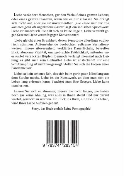 Liebe verändert Menschen, gar den Verlauf eines ganzen Lebens, oder eines ganzen Planeten, wenn wir es nur zulassen. Sie drängt sich nicht auf; aber sie ist unvermeidbar. Die Liebe und der Tod kommen gern als ungeladene Gäste! sagt ein indisches Sprichwort. Liebe ist anarchisch. Sie hält sich an keine Regeln. Liebe verstößt gegen Gesetze! Liebe verstößt gegen Konventionen!Liebe gleicht einer Krankheit, deren Symptome allerdings euphorisch stimmen. Außenstehende beobachten seltsame Verhaltensweisen: innere Abwesenheit, verklärtes Dauerlächeln, beseelter Blick, abnorme Vitalität, unangebrachte Fröhlichkeit, mitunter unerwartet verzücktes Hüpfen. Dennoch verlangt niemand nach Heilung; es gibt auch kein Heilmittel. Liebe ist ansteckend! Für eine Schutzimpfung ist nicht vorgesorgt. Stellen Sie sich die Folgen einer Pandemie vor!Liebe ist kein scheues Reh, das sich beim geringsten Missklang aus dem Staube macht. Liebe ist ein Kunstwerk, an dem man sich ein Leben lang erfreuen kann, beachtet man ihre Gesetze. Liebe kann man lernen.Lassen Sie sich einstimmen, zögern Sie nicht länger; Sie haben noch gar keine Ahnung, was alles in Ihnen steckt und nur darauf wartet, geweckt zu werden. Ein Blick ins Buch, ein Blick ins Leben, wird Ihrer Liebe Auftrieb geben!Sorry, das Buch enthält keine Pornographie!