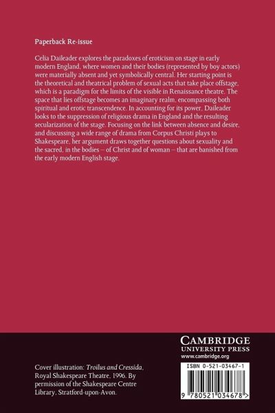 In this 1998 book, Celia Daileader explores the paradoxes of eroticism on the stage in early modern England, where women and their bodies (represented by boy actors) were materially absent and yet symbolically central. Her starting point is the theoretical and theatrical problem of sexual acts that take place offstage, which is a paradigm for the limits of the visible in Renaissance theatre. The space that lies offstage becomes an imaginary realm, encompassing both spiritual and erotic transcendence. In accounting for its power, Daileader looks to the suppression of religious drama in England and the resulting secularization of the stage. Focusing on the link between absence and desire, and discussing a wide range of drama from Corpus Christi plays to Shakespeare, her argument draws together questions about sexuality and the sacred, in the bodies - of Christ and of woman - that are banished from the early modern English stage.