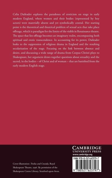 In this 1998 book, Celia Daileader explores the paradoxes of eroticism on the stage in early modern England, where women and their bodies (represented by boy actors) were materially absent and yet symbolically central. Her starting point is the theoretical and theatrical problem of sexual acts that take place offstage, which is a paradigm for the limits of the visible in Renaissance theatre. The space that lies offstage becomes an imaginary realm, encompassing both spiritual and erotic transcendence. In accounting for its power, Daileader looks to the suppression of religious drama in England and the resulting secularization of the stage. Focusing on the link between absence and desire, and discussing a wide range of drama from Corpus Christi plays to Shakespeare, her argument draws together questions about sexuality and the sacred, in the bodies - of Christ and of woman - that are banished from the early modern English stage.