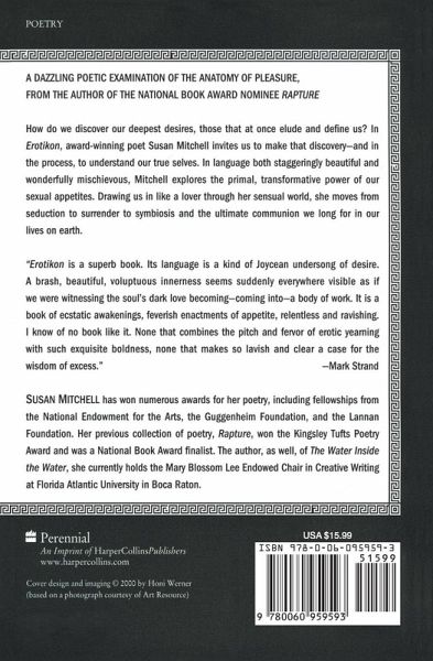 How do we discover our deepest desires, those that at once elude and define us? In Erotikon, award-winning poet Susan Mitchell invites us to make that discovery -- and in the process, to understand our true selves. In language both staggeringly beautiful and wonderfully mischevious, Mitchell explores the primal, transformative power of our sexual appetites. Drawing us in like a lover through her sensual world, she moves from seduction to surrender to symbiosis and the ultimate communion we long for in our lives on earth.