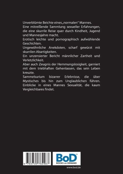Unverblümte Beichte eines "normalen" Mannes. Eine mitreißende Sammlung sexueller Erfahrungen, die eine skurrile Reise quer durch Kindheit, Jugend und Mannesjahre macht. Erotisch leichte und pornographisch aufwühlende Geschichten. Ungewöhnliche Anekdoten, scharf gewürzt mit skurrilen Abartigkeiten. Ein unzensierter Bericht männlicher Zartheit und Verletzlichkeit. Aber auch Zeugnis der Hemmungslosigkeit, garniert mit dem triebhaften Gehenlassen, das sein Leben kreuzte. Sammelsurium bizarrer Erlebnisse, die über Mystisches bis hin zum Unglaublichen führen. Einblicke in eines Mannes Sexualität, die kaum Vergleichbares findet.