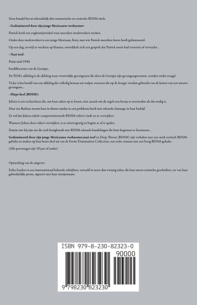 Deze bundel bevat inhoudelijk drie romantische en erotische BDSM-titels. - Gedomineerd door zijn jonge Mexicaanse werknemer: Patrick heeft een yoghurtijswinkel waar meerdere medewerkers werken. Onder deze medewerkers is een jonge Mexicaan, Katy, met wie Patrick meerdere keren heeft gefantaseerd. Op een dag, terwijl ze wachten op klanten, ontwikkelt zich een gesprek dat Patrick nooit had voorzien of verwacht... - Nazi-teef: Parijs eind 1940. hoofdkwartier van de Gestapo. De FEM1-afdeling is de afdeling waar vrouwelijke gevangenen die door de Gestapo zijn gevangengenomen, worden ondervraagd. Vicky is het hoofd van een afdeling die volledig bestaat uit wulpse vrouwen die op de hoogte worden gebracht van de komst van een nieuwe gevangene... - Diepe keel (BDSM): Julieta is een rechercheur die, om haar zaken op te lossen, niet aarzelt om de regels een beetje te overtreden als dat nodig is. Haar zus Barbara neemt haar in dienst omdat ze een probleem heeft met seksuele chantage in haar bedrijf. Ze wil dat Julieta enkele compromitterende BDSM-video's vindt en ze verwijdert. Wanneer Julieta deze video's verwijdert, is ze nieuwsgierig en begint ze af te spelen. Daarin ziet hij zijn zus die zich bezighoudt met BDSM seksuele handelingen die hem beginnen te fascineren... Gedomineerd door zijn jonge Mexicaanse werknemer, nazi-teef en Deep Throat (BDSM) zijn verhalen met een sterk erotisch BDSM-gehalte en maken op hun beurt deel uit van de Erotic Domination Collection, een reeks romans met een hoog BDSM-gehalte. (Alle personages zijn 18 jaar of ouder) Opmerking van de uitgever: Erika Sanders is een internationaal bekende schrijfster, vertaald in meer dan twintig talen, die haar meest erotische geschriften, ver van haar gebruikelijke proza, signeert met haar meisjesnaam.