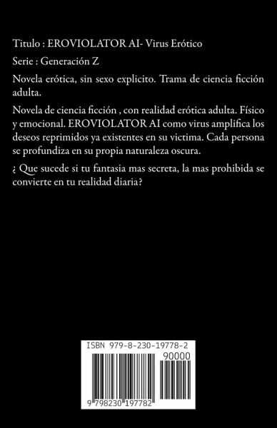 Titulo : EROVIOLATOR AI- Virus Erótico Serie : Generación Z Novela erótica, sin sexo explicito. Trama de ciencia ficción adulta. Novela de ciencia ficción , con realidad erótica adulta. Físico y emocional. EROVIOLATOR AI como virus amplifica los deseos reprimidos ya existentes en su victima. Cada persona se profundiza en su propia naturaleza oscura. ¿ Que sucede si tu fantasia mas secreta, la mas prohibida se convierte en tu realidad diaria?