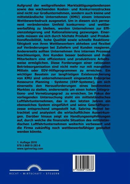 Aufgrund der weitgreifenden Marktsättigungstendenzen sowie des wachsenden Kosten- und Konkurrenzdruckes sind nicht nur Großunternehmen, sondern auch kleine und mittelständische Unternehmen (KMU) einem intensiven Wettbewerbsdruck ausgesetzt. Um in diesem sich permanent verändernden Umfeld konkurrenz- und wettbewerbsfähig zu bleiben, werden Unternehmen zur Effizienzsteigerung und Rationalisierung gezwungen. Einerseits müssen sie sich durch höchste Produkt- und Produktionsflexibilität, hohe Qualität sowie schnelle Reaktionsfähigkeit von ihren Wettbewerbern abheben und flexibel auf Veränderungen bei Zuliefern und Kunden reagieren. Andererseits sollten Unternehmen ihre internen Prozesse beschleunigen, ihre Kunden besser bedienen und ihren Mitarbeitern eine effizientere und produktivere Arbeitsweise ermöglichen. Diese Forderungen einer rationalen Betriebsorganisation sind nicht mehr nur mit manuellen Mitteln oder EDV-Hilfsprogrammen zu erreichen. Ein wichtiger Baustein zur langfristigen Existenzsicherung von KMU sind unternehmensweit eingesetzte Enterprise Ressource Planning - Systeme (ERP-Systeme), um sich einerseits den Herausforderungen eines bestimmten Marktes zu stellen, andererseits um einen hohen Integrations- und Vernetzungsgrad zu erreichen. Im Fokus der vorliegenden Untersuchung steht ein mittelständisches Luftfahrtunternehmen, das in den letzten Jahren ein ebensolches System eingeführt und seine Geschäftsprozesse entsprechend umgestellt hat. Sabrina Meinel betrachtet und analysiert die wirtschaftlichen Auswirkungen. Darüber hinaus zeigt sie Handlungsempfehlungen auf, durch welche die finanzielle Situation des mittelständischen Luftfahrtunternehmen weiterhin verbessert und die Firma zukünftig noch wettbewerbsfähiger gestaltet werden könnte.