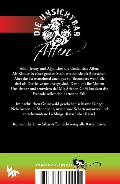 Addi, Jenny und Agan sind die Unsichtbar-Affen.Als Kinder in einer großen Stadt werden sie oft übersehen.Aber das ist manchmal auch gut so. Besonders wenn diedrei als Detektive unterwegs sind. Dann gilt ihr Motto:Unsichtbar und trotzdem da! Mit Äffchen Goffi knacken dieFreunde selbst den härtesten Fall.Im nächtlichen Grunewald geschehen seltsame Dinge:Nebelwesen im Mondlicht, mysteriöse Schattenmänner undverschwundene Lieblinge. Rätsel über Rätsel.Können die Unsichtbar-Affen rechtzeitig alle Rätsel lösen?Der fünfte Band von Boris Pfeiffers Großstadtkrimis für Kinder von heute.