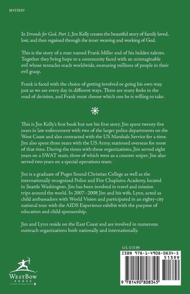 In Errands for God, Part 1, Jim Kelly creates the beautiful story of family loved, lost, and then regained through the inner weaving and working of God. This is the story of a man named Frank Miller and of his hidden talents. Together they bring hope to a community faced with an unimaginable evil whose tentacles reach worldwide, ensnaring millions of people in their evil grasp. Frank is faced with the choice of getting involved or going his own way, just as we are every day in different ways. There are many forks in the road of decision, and Frank must choose which one he is willing to take.