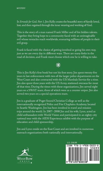 In Errands for God, Part 1, Jim Kelly creates the beautiful story of family loved, lost, and then regained through the inner weaving and working of God. This is the story of a man named Frank Miller and of his hidden talents. Together they bring hope to a community faced with an unimaginable evil whose tentacles reach worldwide, ensnaring millions of people in their evil grasp. Frank is faced with the choice of getting involved or going his own way, just as we are every day in different ways. There are many forks in the road of decision, and Frank must choose which one he is willing to take.