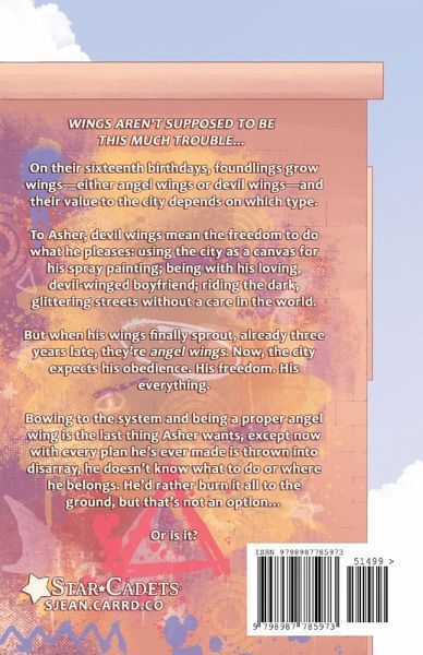 Wings aren't supposed to be this much trouble... On their sixteenth birthday, foundlings grow wings-either angel wings or devil wings-and their value to the city depends on which one. To Asher, devil wings mean the freedom to do what he pleases: using the city as a canvas for his graffiti art; being with his loving, devil-winged boyfriend; riding the dark, glittering streets without a care in the world. But when his wings finally sprout, already three years late, they're angel wings. Now, the city expects his obedience. His freedom. His everything. Bowing to the system and being a proper angel wing is the last thing Asher wants, except now with every plan he's ever made in pieces, he doesn't know what to do or where he belongs. He'd rather burn it all to the ground, but that's not an option... Or is it?