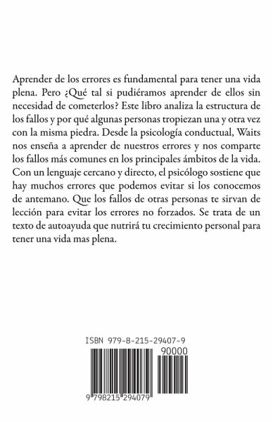 Aprender de los errores es fundamental para tener una vida plena. Pero ¿Qué tal si pudiéramos aprender de ellos sin necesidad de cometerlos? Este libro analiza la estructura de los fallos y por qué algunas personas tropiezan una y otra vez con la misma piedra. Desde la psicología conductual, Waits nos enseña a aprender de nuestros errores y nos comparte los fallos más comunes en los principales ámbitos de la vida. Con un lenguaje cercano y directo, el psicólogo sostiene que hay muchos errores que podemos evitar si los conocemos de antemano. Que los fallos de otras personas te sirvan de lección para evitar los errores no forzados. Se trata de un texto de autoayuda que nutrirá tu crecimiento personal para tener una vida mas plena.