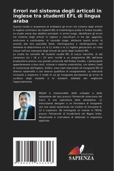 Questo studio si proponeva di analizzare gli errori nel sistema degli articoli in inglese commessi da studenti EFL di madrelingua araba in Arabia Saudita. Lo studio aveva due obiettivi principali: in primo luogo, identificare gli errori nel sistema degli articoli in inglese e classificarli in tre tipi: aggiunta, omissione e sostituzione. In secondo luogo, attribuire questi errori di articolo alla loro possibile fonte, interlinguistica o intralinguistica, nel tentativo di determinare se la L1 araba o la L2 inglese giocassero un ruolo chiave nell'uso improprio degli articoli da parte degli studenti EFL.Lo studio ha coinvolto 60 studenti sauditi EFL di sesso maschile, di età compresa tra i 18 e i 22 anni, iscritti a un programma EFL dell'anno preparatorio presso una grande università dell'Arabia Saudita. I partecipanti appartenevano a due corsi, scienze e materie umanistiche, con diversi livelli di conoscenza dell'inglese. Inoltre, sono stati intervistati 10 insegnanti EFL di diverse nazionalità e con diverse qualifiche di insegnamento. Le interviste miravano a esplorare il modo in cui gli insegnanti percepivano gli errori di scrittura degli studenti e le soluzioni adottate per migliorare l'apprendimento.