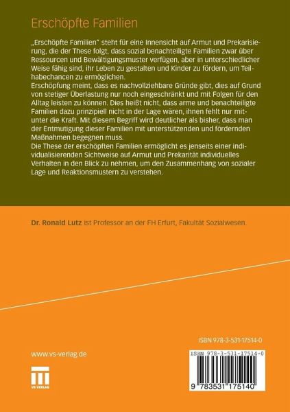 "Erschöpfte Familien" steht für eine Innensicht auf Armut und Prekarisierung, die der These folgt, dass sozial benachteiligte Familien zwar über Ressourcen und Bewältigungsmuster verfügen, aber in unterschiedlicher Weise fähig sind, ihr Leben zu gestalten und Kinder zu fördern, um Teilhabechancen zu ermöglichen.