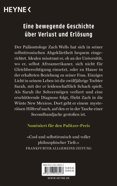 Der Paläontologe Zach Wells hat sich in seiner selbstironischen Abgeklärtheit bequem eingerichtet: Idealen misstraut er, ob an der Universität, wo er, selbst Afroamerikaner, sich nicht für Gleichberechtigung einsetzt, oder zu Hause in der erkalteten Beziehung zu seiner Frau. Einzige Freude in seinem Leben ist die zwölfjährige Tochter Sarah. Als diese ihr Sehvermögen verliert und eine erschütternde Diagnose folgt, flieht Zach in die Wüste New Mexicos. Dort geht er einem mysteriösen Hilferuf nach, den er in einer Second-Hand-Jacke gefunden hat. Ebenso mitreißend wie psychologisch feinsinnig erzählt der Pulitzer-Preis-Finalist eine große Geschichte über Verlust und Erlösung.