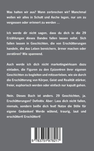 Was halten wir aus? Wann zerbrechen wir? Manchmal wollen wir alles in Schutt und Asche legen, nur um zu vergessen oder erinnert zu werden ...Ich werde dir nicht sagen, dass du dich in die 29 Erzählungen dieses Bandes fallen lassen sollst. Sich fallen lassen in Geschichten, die von Erschütterungen handeln, die das Leben bereichern, ärmer machen oder zerstören? Wie spannend.Auch werde ich dich nicht marketingwirksam dazu einladen, die Figuren zu den Epizentren ihrer eigenen Geschichten zu begleiten und mitzuerleben, wie sie durch die Erschütterung von Körper, Geist und Realität stärker, freier, euphorisch werden oder einfach nur kaputt gehen.Nein. Dieses Buch ist anders. 29 Geschichten, ja. Erschütterungen? Definitiv. Aber: Lass dich nicht fallen, niemals, sondern beiße dich fest! Nutze die Stille für eigene Gedanken! Werde wütend, traurig, laut und erschüttert! Erschüttert!