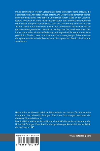 Im 20. Jahrhundert werden verstärkt abstrakte literarische Texte erzeugt, die als semiotische Angebote komponiert sind. Die Generierung der semantischen Dimension des Textes wird dabei in unterschiedlichem Maße an den Leser delegiert, und zwar im Sinne nicht abschließbarer, auf semiotischen Strukturen basierender Interpretationsprozesse oder der Generierung von literarischen Texten, die der Autor dem Leser in Form von potenziellen Texten oder Textangeboten bereitgestellt hat. Dieser Band verfolgt das Ziel, den literarischen Text im 20. Jahrhundert als Herausforderung und zugleich als Provokation zur Sinnproduktion für den Leser zu erfassen und an mustergültigen Fallstudien aus dem gesamten Bereich der Romania und dem gesamten Bereich der Literatur zu erläutern.