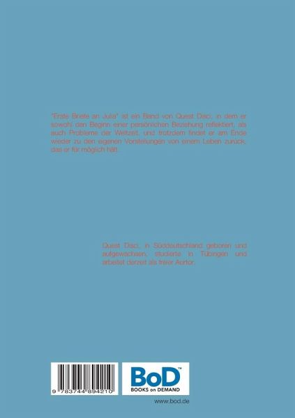 "Erste Briefe an Julia", ist ein Band von Quest Disci, in dem er sowohl den Beginn einer persönlichen Beziehung reflektiert, als auch Probleme der Weltzeit, und trotzdem findet er am Ende wieder zu den eigenen Vorstellungen von einem Leben zurück, das er für möglich hält.