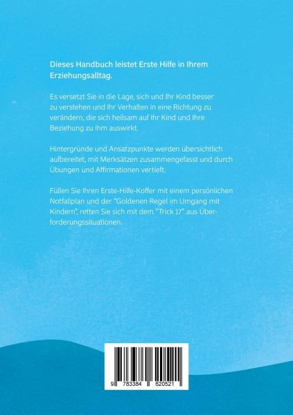 Dieses Handbuch leistet Erste Hilfe in Ihrem Erziehungsalltag. Es versetzt Sie in die Lage, sich und Ihr Kind besser zu verstehen und Ihr Verhalten in eine Richtung zu verändern, die sich heilsam auf Ihr Kind und Ihre Beziehung zu ihm auswirkt. Hintergründe und Ansatzpunkte werden übersichtlich aufbereitet, mit Merksätzen zusammengefasst und durch Übungen und Affirmationen vertieft.Füllen Sie Ihren Erste-Hilfe-Koffer mit einem persönlichen Notfallplan und der "Goldenen Regel im Umgang mit Kindern", retten Sie sich mit dem "Trick 17" aus Überforderungssituationen.