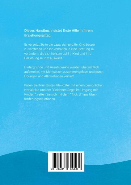 Dieses Handbuch leistet Erste Hilfe in Ihrem Erziehungsalltag. Es versetzt Sie in die Lage, sich und Ihr Kind besser zu verstehen und Ihr Verhalten in eine Richtung zu verändern, die sich heilsam auf Ihr Kind und Ihre Beziehung zu ihm auswirkt. Hintergründe und Ansatzpunkte werden übersichtlich aufbereitet, mit Merksätzen zusammengefasst und durch Übungen und Affirmationen vertieft.Füllen Sie Ihren Erste-Hilfe-Koffer mit einem persönlichen Notfallplan und der "Goldenen Regel im Umgang mit Kindern", retten Sie sich mit dem "Trick 17" aus Überforderungssituationen.
