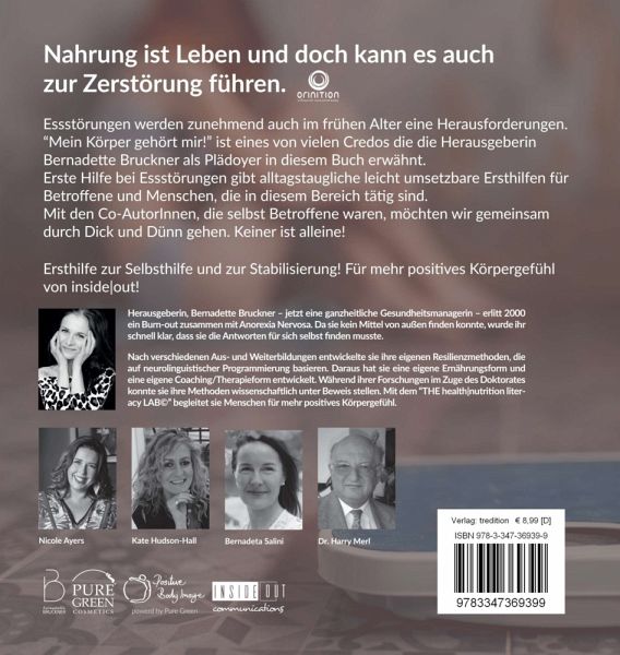 Nahrung ist Leben und doch kann es auch zur Zerstörung führen. Essstörungen wird zunehmend auch im frühen Alter eine Herausforderungen. "Mein Körper gehört mir!" ist eines von vielen Credos die die Herausgeberin Bernadette Bruckner als Plädoyer in diesem Buch erwähnt. Erste Hilfe bei Essstörungen gibt alltagstaugliche leicht umsetzbare Ersthilfen für Betroffene und Menschen, die in diesem Bereich tätig sind. Mit den Co-AutorInnen, die selbst Betroffene waren, möchten wir gemeinsam durch Dick und Dünn gehen. Keiner ist alleine! Ersthilfe zur Selbsthilfe und zur Stabilisierung!