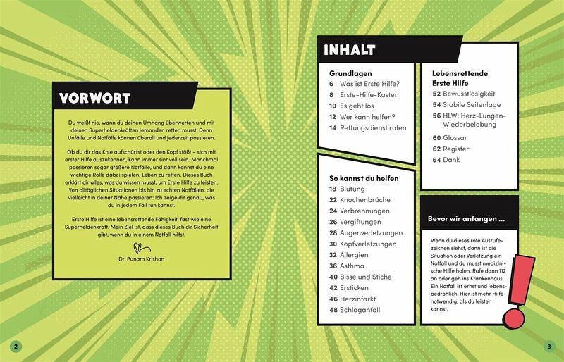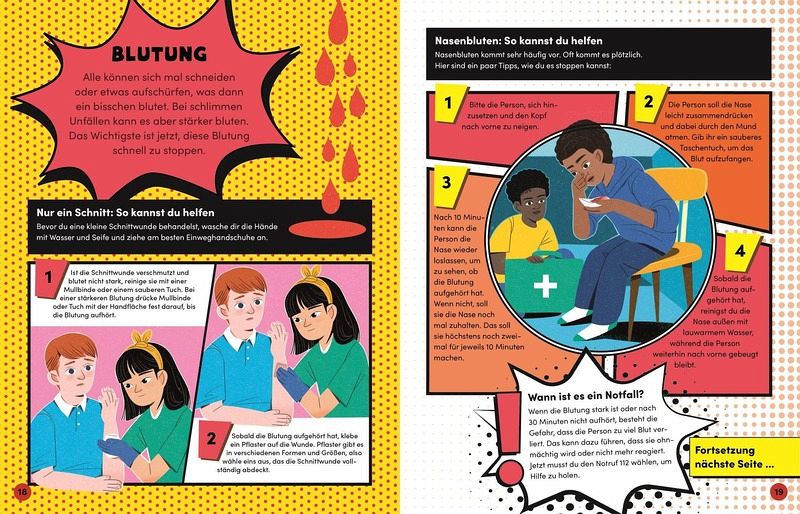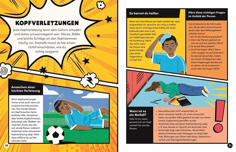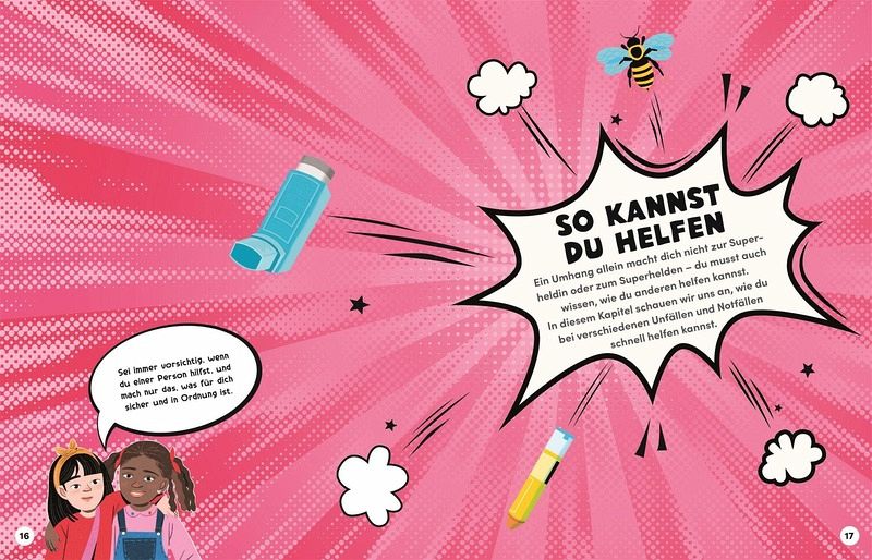 Ob in der Schule, beim Spielen oder unterwegs - Unfälle passieren. Dieses Erste-Hilfe-Kinderbuch zeigt Grundschulkindern ab 7 Jahren, wie sie im Notfall sicher reagieren können.Im Stil von Superhelden-Comics werden wichtige Szenarien wie Verbrennungen, Blutungen oder erste Hilfe bei Allergien Schritt für Schritt erklärt. Ob kleine Verletzungen oder echte Notfälle: Die Kinder lernen, wie wichtig erste Hilfe ist und dass sie mit ihren Fähigkeiten sogar Leben retten können. Das Buch baut Ängste ab und zeigt, wann Erwachsene oder der Rettungsdienst gebraucht werden. So entwickeln die jungen Held_innen Selbstbewusstsein, Mut und Verantwortungsgefühl - echte Superkräfte im Alltag.