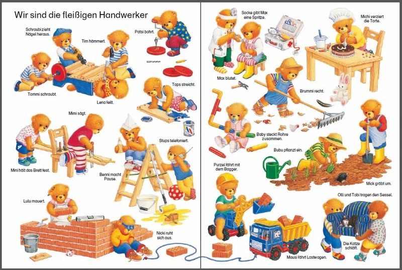 Was erleben kleine Bärenkinder jeden Tag? Stups wirft den Ball hoch, Max baut einen Turm und Purzel fährt mit dem Bagger. Helmut Spanners Bilderbuch-Klassiker zeigt auf jeder Doppelseite einen anderen Bereich der kindlichen Erfahrungswelt. Miteinander spielen, durch die Gegend sausen oder im Haushalt mithelfen: Kinder ab einem Jahr finden sich in den Abenteuern von Max, Brummi und ihren Freunden wieder.