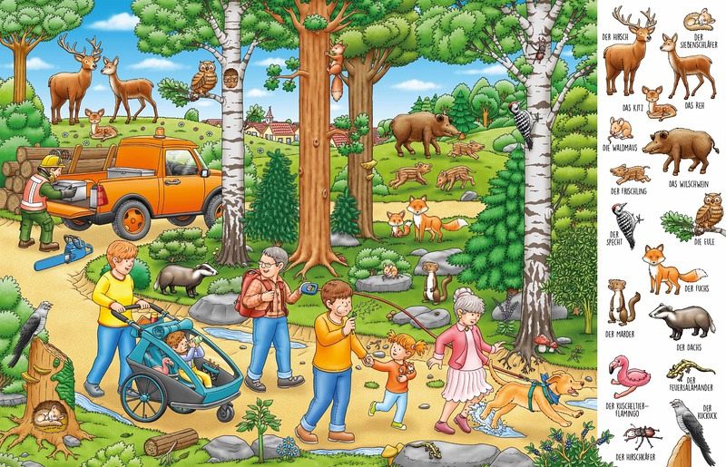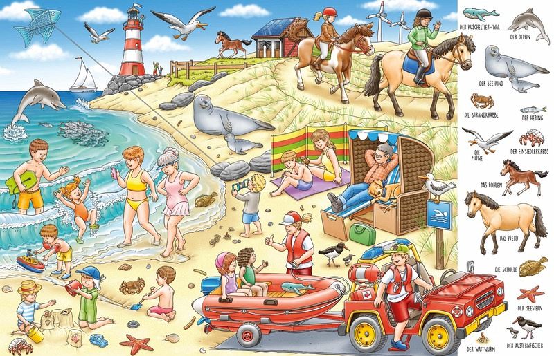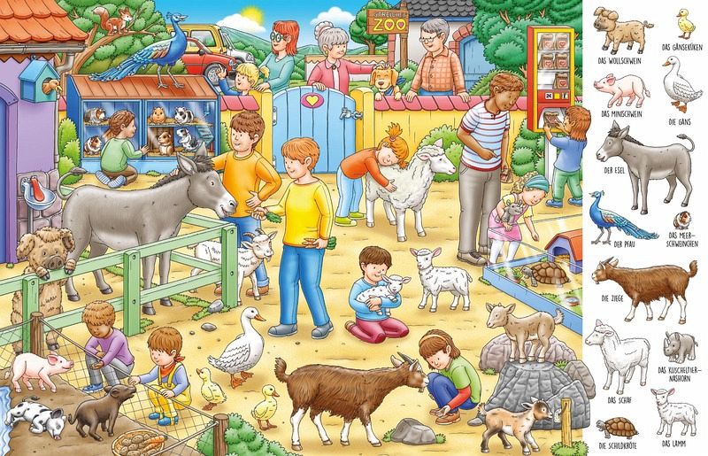 Hier leben Mia und Elias, umgeben von vielen Tieren. Direkt in ihrem Garten sind Vögelchen, Schnecken, Marienkäfer zuhause. Und wenn sie alle gemeinsam mit ihren Großeltern einen Waldspaziergang machen, entdecken sie Eichhörnchen, Rehe und sogar eine Eule hoch oben im Baum. Welche Tiere werden Mia und Elias wohl im Zoo sehen? Bestimmt ganz andere als auf dem Bauernhof. Und besonders freuen sie sich auf den Ausflug ans Meer. Denn dort gibt es auch viel zu entdecken.