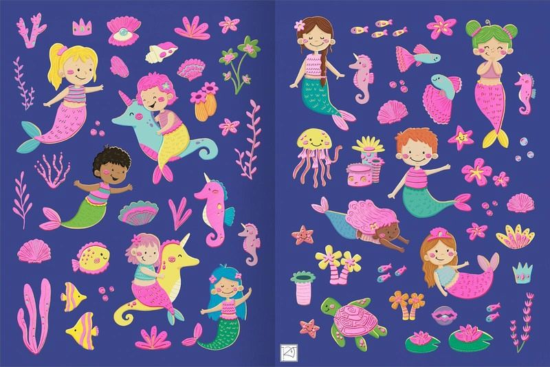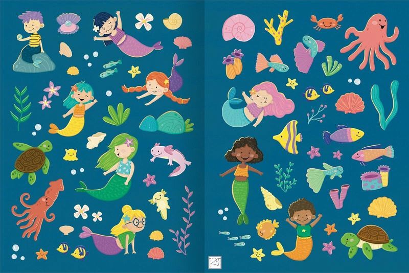 Das großformatige Stickeralbum bietet jede Menge Raum, der Fantasie freien Lauf zu lassen und eigene, schillernde Szenen rund um das Thema Meerjungfrauen zu erschaffen.