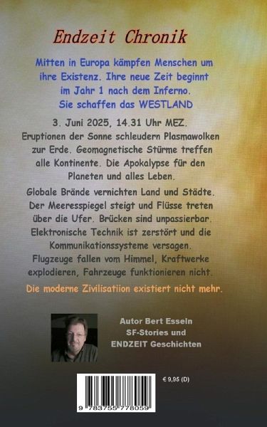 Endzeit-Chronik3.Juni 2025, 14.31 Uhr MEZ.Eruptionen der Sonne schleudern Plasmawolken zur Erde. Geomagnetische Stürme treffen alle Kontinente. Die Apokalypse für den Planeten und alles Leben.Mitten in Europa kämpfen Menschen um ihre Existenz. Ihre neue Zeit beginnt im Jahr 1 nach dem Inferno.Sie schaffen das neue WESTLAND.Globale Brände vernichten Land und Städte. Der Meeresspiegel steigt und die Flüsse treten über die Ufer. Brücken sind unpassierbar. Elektronische Technik ist zerstört und die Kommunikationssysteme versagen. Flugzeuge fallen vom Himmel, Kraftwerke explodieren, Fahrzeuge funktionieren nicht.Die moderne Zivilisation existiert nicht mehr.
