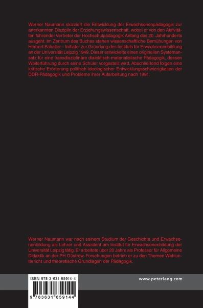 Werner Naumann skizziert die Entwicklung der Erwachsenenpädagogik zur anerkannten Disziplin der Erziehungswissenschaft, wobei er von den Aktivitäten führender Vertreter der Hochschulpädagogik Anfang des 20. Jahrhunderts ausgeht. Im Zentrum des Buches stehen wissenschaftliche Bemühungen von Herbert Schaller - Initiator zur Gründung des Instituts für Erwachsenenbildung an der Universität Leipzig 1949. Dieser entwickelte einen originellen Systemansatz für eine transdisziplinäre dialektisch-materialistische Pädagogik, dessen Weiterführung durch seine Schüler vorgestellt wird. Abschließend folgen eine kritische Erörterung politisch-ideologischer Entwicklungsschwierigkeiten der DDR-Pädagogik und Probleme ihrer Aufarbeitung nach 1991.