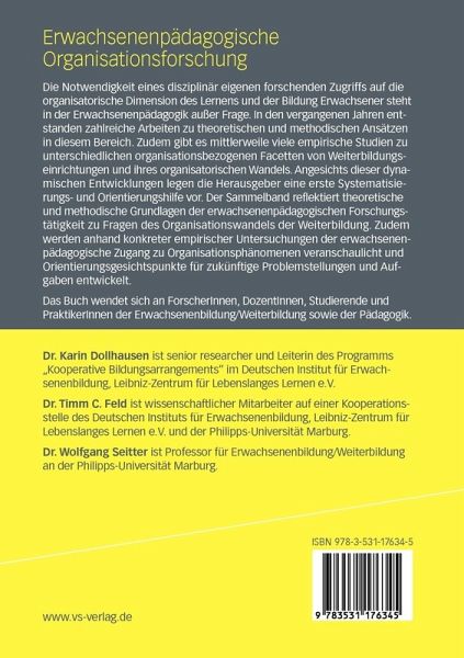 Erwachsenenpädagogische Organisationsforschung. Zur Einleitung in den Band.- Erwachsenenpädagogische Organisationsforschung. Zur Einleitung in den Band.- Durchblick: Theorien und Methoden.- (Organisations-)theoretische Bezüge in erwachsenenpädagogischen Arbeiten. Eine Bestandsaufnahme.- Organisationaler Wandel als Thema der Erwachsenenbildung.- Erwachsenenbildungswissenschaftliche Netzwerkforschung.- Methoden der Organisationsforschung.- Einblick: Empirische Befunde.- Organisationstypen der Weiterbildung. Eine empirische Analyse aus der Perspektive des Neo-Institutionalismus.- Realisierung und Konkretisierung von Dienstleistungsorganisationen für die Weiterbildungsberatung in Regionen.- Netzwerkmanagement in der Weiterbildung. Organisations- und professionsbezogene Rekonstruktionen.- Auswirkungen von bildungspolitischen Förderprogrammen auf Organisationen der Weiterbildung am Beispiel eines Modellprojekts.- Steuerungsprobleme im Zweiten Bildungsweg. Eine empirische und organisationstheoretische Analyse des Phänomens der bildungssystemischen Funktionsüberlappung.- Interkulturelle Bildungsangebote. Formen 'Beigeordneter Bildung' im Unternehmenskontext.- "Planning in the making". Konturen einer möglichkeitsorientierten Planungskultur.- Ausbalancierung pädagogischen Handelns im organisationalen Kontext am Beispiel der betrieblichen Berufsbildung.- Ausblick: Entwicklungen und Perspektiven.- Pädagogische Organisationsforschung in der Erwachsenen- und Weiterbildung. Probleme, Trends und Bedarfe.- Institutionalformen für das lebenslange Lernen. Eckpunkte eines erwachsenenpädagogischen Forschungsprogramms.- Hybride Lernwelten. Organisation von Weiterbildung jenseits des klassischen Kursgeschäfts.- Inklusion selbst entwickeln. Der Index für Inklusion alsSelbstevaluationsinstrument von Weiterbildungseinrichtungen.- Weiterbildungseinrichtungen im Wandel. Gesellschaftliche Einflussfaktoren und organisationale Entwicklungstendenzen von Weiterbildungseinrichtungen.