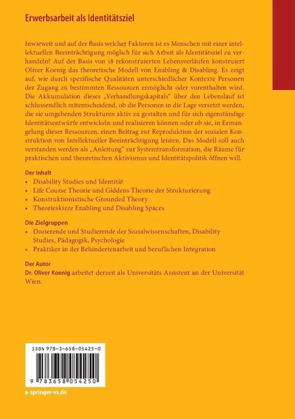 Inwieweit und auf der Basis welcher Faktoren ist es Menschen mit einer intellektuellen Beeinträchtigung möglich für sich Arbeit als Identitätsziel zu verhandeln? Auf der Basis von 18 rekonstruierten Lebensverläufen konstruiert Oliver Koenig das theoretische Modell von Enabling & Disabling. Es zeigt auf, wie durch spezifische Qualitäten unterschiedlicher Kontexte Personen der Zugang zu bestimmten Ressourcen ermöglicht oder vorenthalten wird. Die Akkumulation dieses "Verhandlungskapitals" über den Lebenslauf ist schlussendlich mitentscheidend, ob die Personen in dieLage versetzt werden, die sie umgebenden Strukturen aktiv zu gestalten und für sich eigenständige Identitätsentwürfe entwickeln und realisieren können oder ob sie, in Ermangelung dieser Ressourcen, einen Beitrag zur Reproduktion der sozialen Konstruktion von Intellektueller Beeinträchtigung leisten. Das Modell soll auch verstanden werden als "Anleitung" zur Systemtransformation, die Räume für praktischen und theoretischen Aktivismus und Identitätspolitik öffnen will.