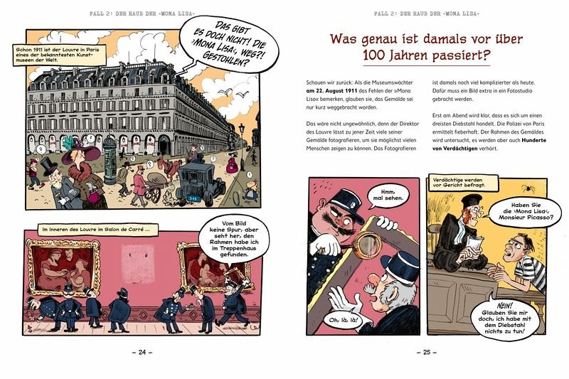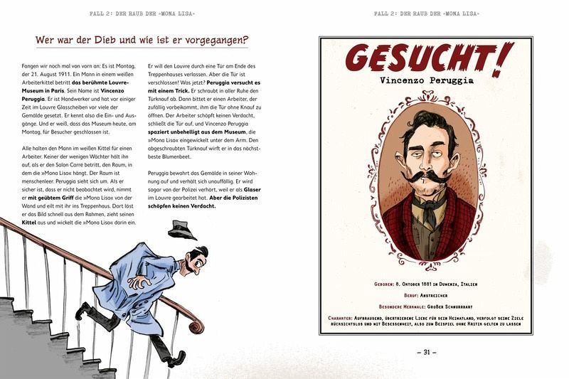 Unfassbar! Eben noch hing die Mona Lisa, das berühmteste Gemälde der Welt, gut gesichert im Museum. Jetzt ist sie verschwunden. Wie konnte das passieren? Und wer ist der Täter? Jetzt ist Ermittlungsarbeit gefragt! In diesem Comic-Sachbuch können Hobbydetektiv_innen hautnah miterleben, wie fünf der spannendsten und aufsehenerregendsten Kriminalfälle der Geschichte aufgelöst wurden. Dabei schauen sie Polizei und Kripo bei ihren Ermittlungen über die Schulter und erhalten spannende Einblicke in die Kriminal- und Polizeigeschichte. In diesem Band sind folgende Kriminalfälle enthalten: