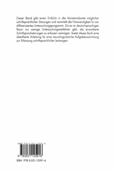 "Erworbene Schriftsprachstörungen" gibt einen Einblick in die Variationsbreite möglicher schriftsprachlicher Störungen und vermittelt die Notwendigkeit für ein differenziertes Untersuchungsprogramm.Da es im deutschsprachigen Raum nur wenige Untersuchungsverfahren gibt, die erworbene Schriftsprachstörungen zu erfassen vermögen, bietet dieses Buch eine detaillierte Anleitung für eine neurolinguistische Aufgabensammlung zur Erfassung schriftsprachlicher Leistungen.