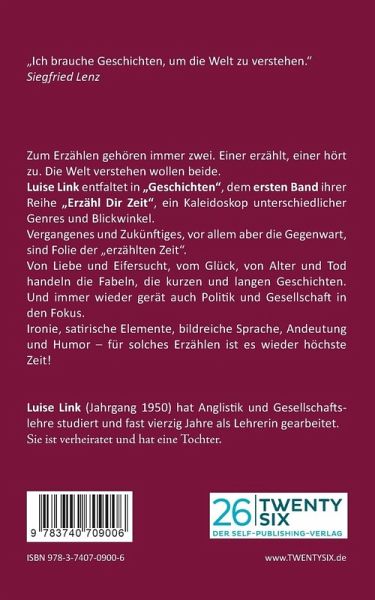In "Geschichten", dem ersten Band der Reihe "Erzähl Dir Zeit", entfaltet Luise Link ein Kaleidoskop unterschiedlicher Genres und Blickwinkel.Vergangenes und Zukünftiges, vor allem aber die Gegenwart, sind Folie der "erzählten Zeit".Von Liebe und Eifersucht, vom Glück, von Alter und Tod handeln die Geschichten und Fabeln. Und immer wieder gerät auch Politik und Gesellschaft in den Fokus.Ironie, bildreiche Sprache, Andeutung und Humor - für solches Erzählen ist es wieder höchste Zeit!