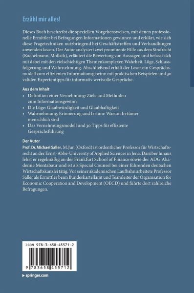 Was genau ist eine Vernehmung? Zielsetzung Informationsgewinn.- Zwei Fälle aus dem Strafrecht: Kachelmann und Mollath.- Vernehmung nach der Deutschen Strafprozessordnung.- Verschiedene Vernehmungsmethoden.- Die Lüge: Glaubwürdigkeit und Glaubhaftigkeit.- Eigene Erfahrungen mit Lügen in der Vernehmung.- Erkenntnisse aus der Mentiologie.- Lügen und Körpersprache.- Das Motiv hinter einer Aussage.- Die Undeutsch-Hypothese.- Warnhinweise: Pinocchios Nase existiert nicht - oder doch?.- Wahrnehmung, Erinnerung und Irrtum: Irren ist menschlich.- Die Wahrnehmung.- Probleme mit der Erinnerung.- Wiedergabe von Erinnerungen.- Wiedergabetechniken.- Das Vernehmungsmodell: Phase 1: Vorbereitung.- Phase 2: Opening.- Phasen 3 und 4: Regeln für den freien Bericht und die Befragung.-Optional: Das Geständnis.- Ende der Befragung und informelles Nachgespräch: Five minutes that matter.- 30 Tipps für wertvollere Gespräche.