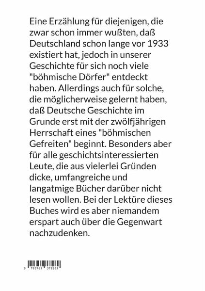 Eine Erzählung für diejenigen, die zwar schon immer wußten, daß Deutschland schon lange vor 1933 existiert hat, jedoch in unserer Geschichte für sich noch viele "böhmische Dörfer" entdeckt haben. Allerdings auch für solche, die möglicherweise gelernt haben, daß Deutsche Geschichte im Grunde erst mit der zwölfjährigen Herrschaft eines "böhmischen Gefreiten" beginnt. Besonders aber für alle geschichtsinteressierten Leute, die aus vielerlei Gründen dicke, umfangreiche und langatmige Bücher darüber nicht lesen wollen.