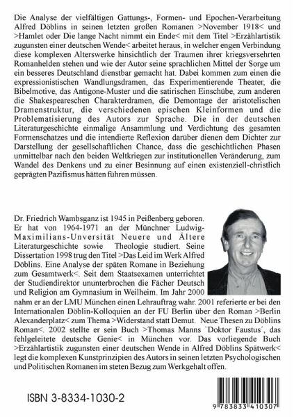 Die Analyse der vielfäligen Gattungs-, Formen- und Epochen-Verarbeitung Alfred Döblins in seinen letzten großen Romanen >November 1918< und >Hamlet oder Die lange Nacht nimmt ein Ende< arbeitet unter dem Titel >Erzählartistik zugunsten einer deutschen Wende< heraus, in welcher engen Verbindung diese komplexen Alterswerke hinsichtlich der Traumen ihrer kriegsversehrten Romanhelden stehen und wie der Autor seine sprachlichen Mittel der Sorge um ein besseres Deutschland dienstbar gemacht hat. Dabei kommen zum einen die expressionistischen Wandlungsdramen, das Experimentierende Theater, die Bibelmotive, das Antigone-Muster und die satirischen Einschübe, zum anderen die Shakespearschen Charakterdramen, die Demontage der aristotelischen Dramenstruktur, die verschiedenen epischen Kleinformen und die Problematisierung des Autors zur Sprache. Die in der deutschen Literaturgeschichte einmalige Ansammlung und Verdichtung des gesamten Formenschatzes und die intendierte Reflexion darüber dienen dem Dichter zur Darstellung der gesellschaftlichen Chance, dass die geschichtlichen Phasen unmittelbar nach den beiden Weltkriegen zur institutionellen Veränderung, zum Wandel des Denkens und zu einer Besinnung auf einen existenziell-christlich geprägten Pazifimus hätten führen müssen.