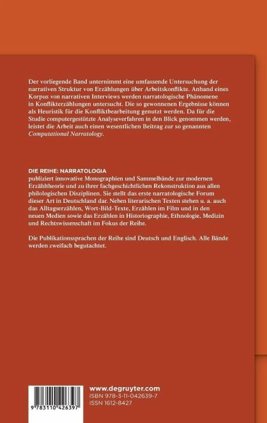 Der vorliegende Band untersucht die narrative Struktur von Erzählungen über Arbeitskonflikte anhand eines Korpus von narrativen Interviews. So lässt sich die Konflikthaftigkeit einer Situation an der Art der Erzählung über diese Situation ablesen. Die Ergebnisse können als Heuristik für die Konfliktbearbeitung genutzt werden. Für die Analyse werden insbesondere die konkrete Anwendbarkeit der narratologischen Konzepte sowie ihre Operationalisierung im Rahmen computergestützter Analyseverfahren in den Blick genommen. Auf Grundlage dieses sowohl methodologischen als auch anwendungsorientierten Zugangs werden Erkenntnisse gewonnen, die für die narratologische Theorie relevant sind. Gleichzeitig leistet der computergestützte Ansatz einen Beitrag zum Feld der so genannten Computational Narratology.