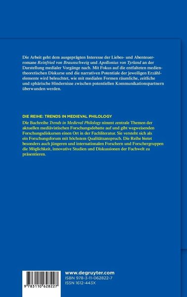 Die Arbeit analysiert die vielfältige Darstellung medialer Prozesse in zwei spätmittelalterlichen ,Liebes- und Abenteuerromanen': Reinfried von Braunschweig und Apollonius von Tyrland. Mit dem Interesse an Medialität schließt sie an einen aktuellen Forschungsschwerpunkt der germanistischen Mediävistik an, durch die Auseinandersetzung mit erzählten medialen Vorgängen setzt sie einen originellen Fokus im Forschungsfeld. Medientheoretisch fundiert und historisch sensibel widmet die Untersuchung sich in close-readings den medialen Formen, die auf der Textebene in Erscheinung treten und mithilfe derer die Figuren Raum-, Zeit-, und Sphärengrenzen kommunikativ überwinden. Beide Texte heben die durch mediale Vorgänge eröffneten Handlungsmöglichkeiten sowie die Relevanz von Medienkompetenz hervor und profilieren literarische Texte selbst als mediale Formen mit besonderen Vermittlungspotentialen. Indem erzählte Mediation jeweils zur Entfaltung narrativer Komplexität und Tiefe genutzt wird, erweist sich in der vergleichenden Betrachtung der Blick auf mediale Phänomene auch als Schlüssel zu der inhaltlichen Schwerpunktsetzung und dem erzählerischen Profil der Einzeltexte.