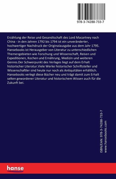 Erzählung der Reise und Gesandtschaft des Lord Macartney nach China - in den Jahren 1792 bis 1794 ist ein unveränderter, hochwertiger Nachdruck der Originalausgabe aus dem Jahr 1795.