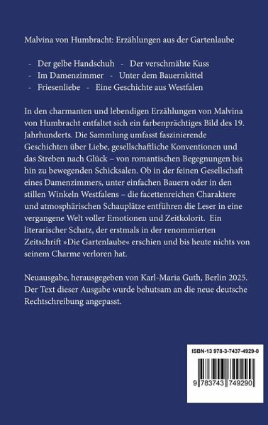 Malvina von Humbracht: Erzählungen aus der Gartenlaube In den charmanten und lebendigen Erzählungen von Malvina von Humbracht entfaltet sich ein farbenprächtiges Bild des 19. Jahrhunderts. Die Sammlung umfasst faszinierende Geschichten über Liebe, gesellschaftliche Konventionen und das Streben nach Glück - von romantischen Begegnungen bis hin zu bewegenden Schicksalen. Ob in der feinen Gesellschaft eines Damenzimmers, unter einfachen Bauern oder in den stillen Winkeln Westfalens - die facettenreichen Charaktere und atmosphärischen Schauplätze entführen die Leser in eine vergangene Welt voller Emotionen und Zeitkolorit. Ein literarischer Schatz, der erstmals in der renommierten Zeitschrift »Die Gartenlaube« erschien und bis heute nichts von seinem Charme verloren hat. Der gelbe Handschuh: »Die Gartenlaube«, Heft 4-5, 1859 unter dem Namen »Louise Ernesti«. Der verschmähte Kuss: »Die Gartenlaube«, Heft 12, 1860 unter dem Namen »Louise Ernesti«. Im Damenzimmer: »Die Gartenlaube«, Heft 40-41, 1863 unter dem Namen »Louise Ernesti«. Unter dem Bauernkittel: »Die Gartenlaube«, Heft 33-34, 1864 unter dem Namen »L. Ernesti«. Friesenliebe: »Die Gartenlaube«, Heft 47-9, 1865. Eine Geschichte aus Westfalen: »Die Gartenlaube«, Heft 39, 1877. Neuausgabe, herausgegeben von Karl-Maria Guth, Berlin 2025. Der Text dieser Ausgabe wurde behutsam an die neue deutsche Rechtschreibung angepasst. Gesetzt aus der Minion Pro, 11 pt. Henricus - Edition Deutsche Klassik GmbH