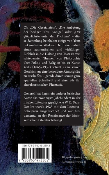 Ob "Die Gesetztafeln", "Die Anbetung der heiligen drei Könige" oder "Der glücklichste unter den Dichtern" - diese Sammlung beinhaltet einige von Yeats bekanntesten Werken. Der Leser erhält einen authentischen und vielfältigen Einblick in die Haltung von Yeats zu verschiedensten Themen, von Philosophie über Politik und Religion bis zu Kunst. Yeats (1865-1939) schafft es in seinen Geschichten eine besondere Atmosphäre zu erschaffen - gerade durch seinen ganz speziellen Schreibstil und einer für ihn charakteristischen Phantasie. Generell hat kaum ein anderer britischer Autor das zwanzigste Jahrhundert in der irischen Literatur geprägt wie W. B. Yeats. Der Ire wurde 1923 mit dem Literaturnobelpreis ausgezeichnet und war fundamental an der Renaissance der irisch-keltischen Literatur beteiligt.
